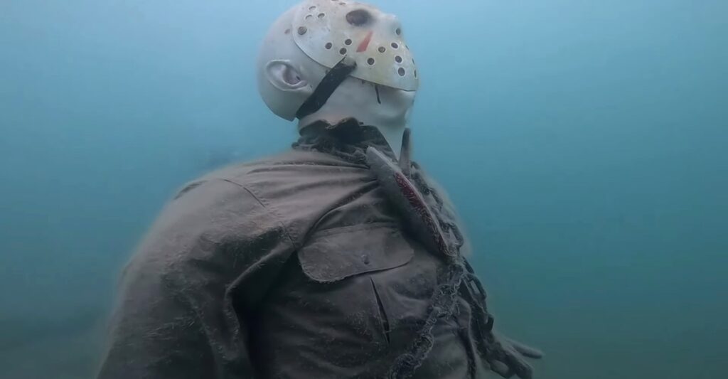 Buzos locales encontraron y grabaron a este muñeco de Jason, que permanecía encadenado, con el “cuerpo” hinchado y esperando a sus rescatistas.