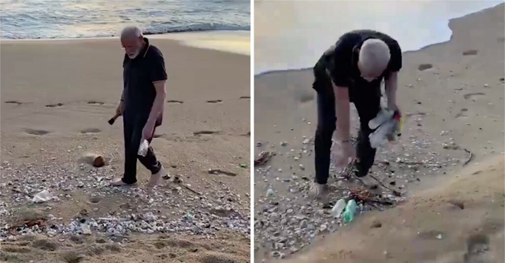 Hace unos días, Modi fue captado en una playa en la ciudad de Mahabalipuram recogiendo botellas de agua, distintos plásticos y otros desechos. Con sus pies descalzos y tranquilo.